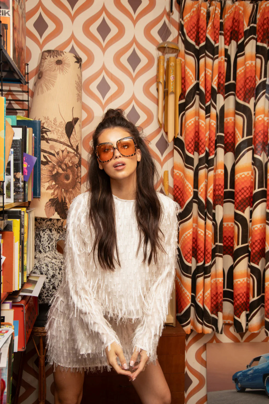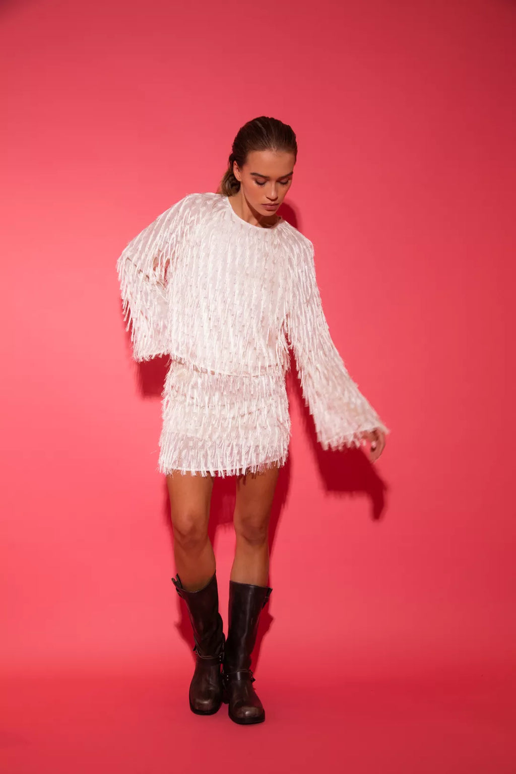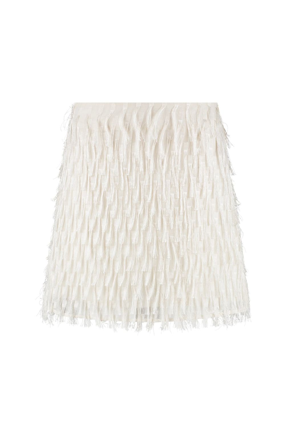 De rok heeft een blinde ritssluiting aan de zijkant voor een strakke, minimalistische look en is versierd met franjes die een leuk, speels effect geven. De Allison Skirt is ideaal om te combineren met een oversized T-shirt en stoere boots voor een casual, maar stijlvolle outfit. Of combineer hem met de bijpassende Flo Blouse voor een complete en trendy set!